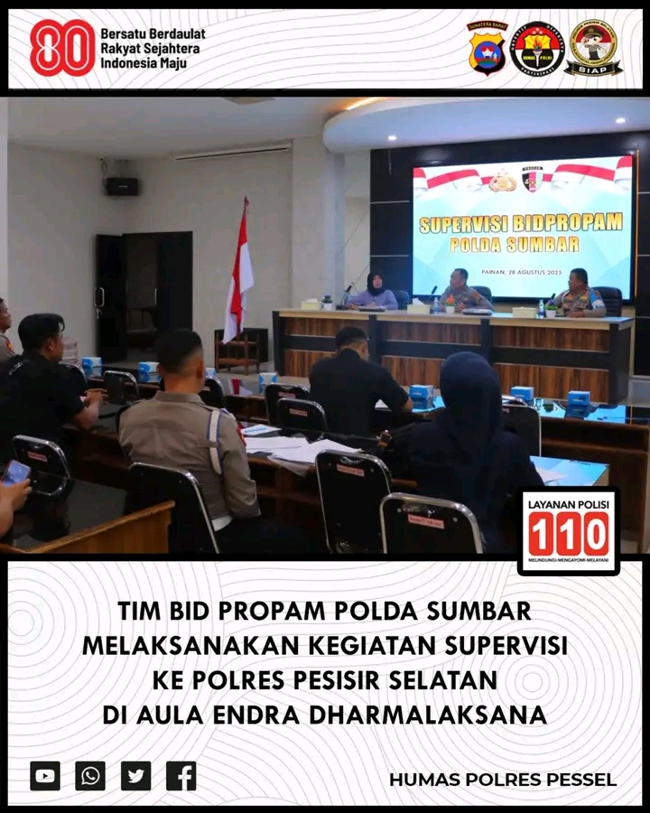 Pesisir Selatan – Bidang Profesi dan Pengamanan (Bidpropam) Polda Sumatera Barat menggelar kegiatan supervisi terhadap Seksi Profesi dan Pengamanan (Sipropam) Polres Pesisir Selatan. Kegiatan ini berlangsung pada Kamis, 28 Agustus 2025, di Aula Endra Dharmalaksana Polres Pesisir Selatan, sebagai upaya menjaga kedisiplinan dan profesionalisme personel.