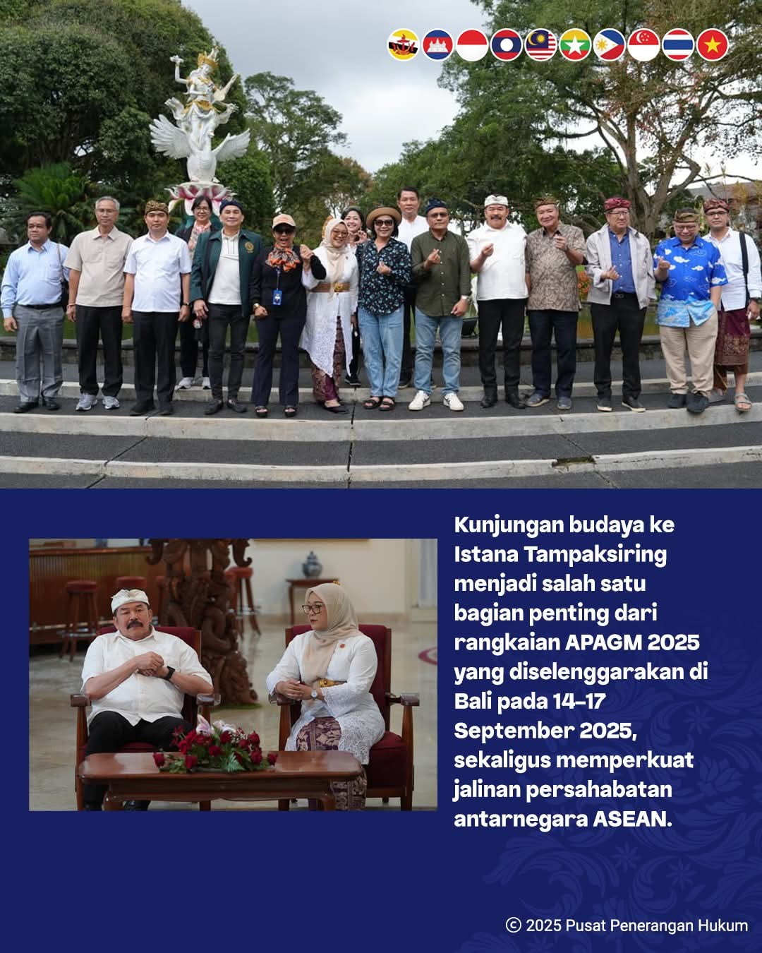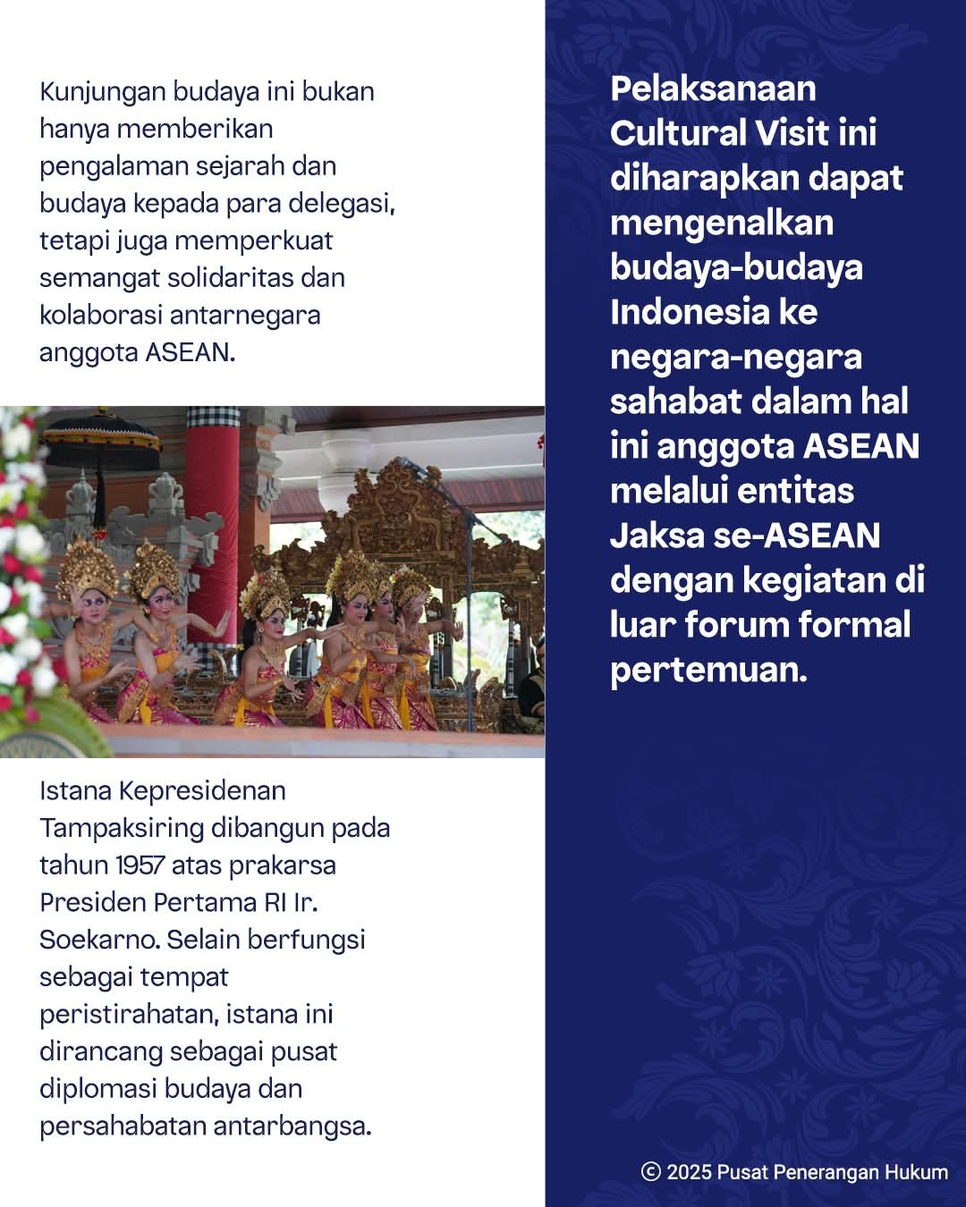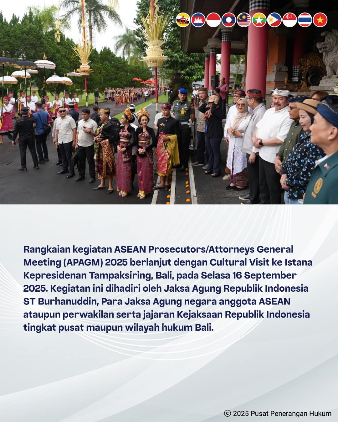 Rangkaian kegiatan ASEAN Prosecutors/Attorneys General Meeting (APAGM) 2025 berlanjut dengan Cultural Visit ke Istana Kepresidenan Tampaksiring, Bali, pada Selasa, 16 September 2025. Kegiatan ini dihadiri oleh Jaksa Agung Republik Indonesia, ST Burhanuddin, serta para Jaksa Agung negara anggota ASEAN dan perwakilan dari Kejaksaan Republik Indonesia.