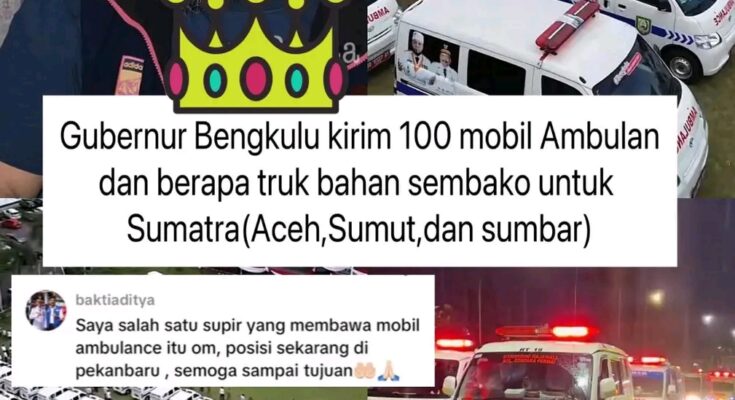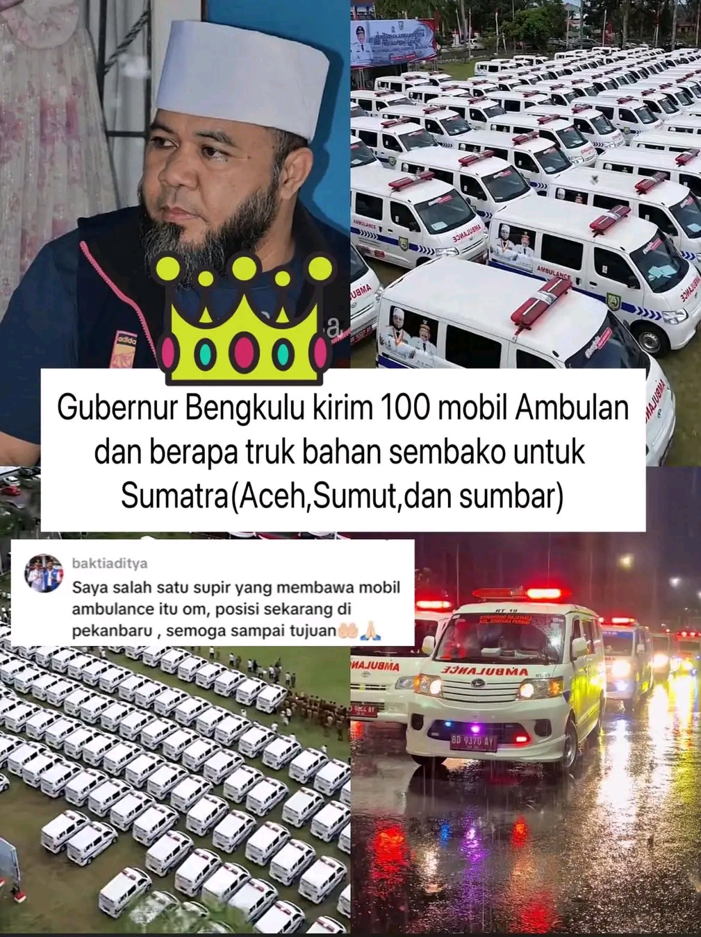 Bengkulu – Gubernur Bengkulu, Rohidin Mersada, mengirimkan bantuan kemanusiaan untuk korban bencana di Aceh, Sumatra Barat, dan Sumatra Utara. Bantuan tersebut berupa 100 ambulans dan bahan sembako yang terdiri dari beras, minyak goreng, gula, mie instan, dan lain-lain.