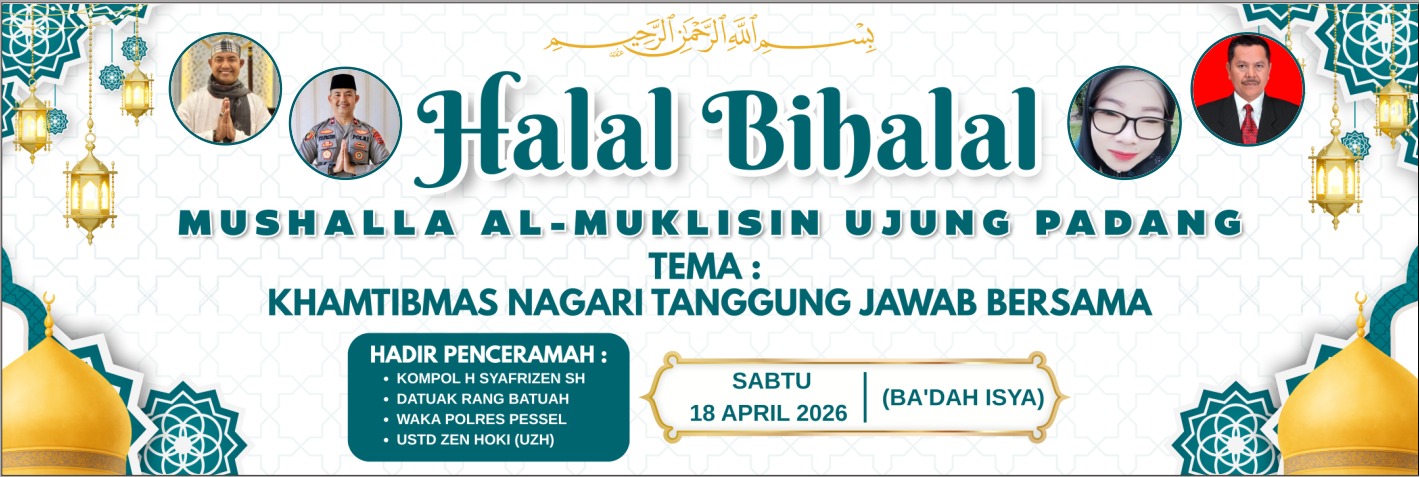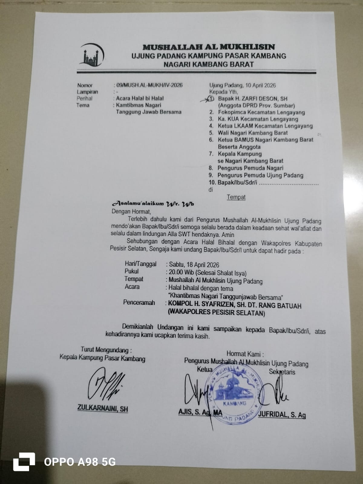 Pesisir Selatan – Wakapolres Pesisir Selatan, Kompol Syafrizen, S.H., Dt. Rang Batuah, dijadwalkan menjadi penceramah dalam acara halalbihalal bertema “Khamtibmas Nagari Tanggung Jawab Bersama” di Mushala Al-Mukhlisin, Ujung Padang Kambang Barat, Kecamatan Lengayang, Kabupaten Pesisir Selatan, Sabtu (18/4/2026) pukul 20.00 WIB.