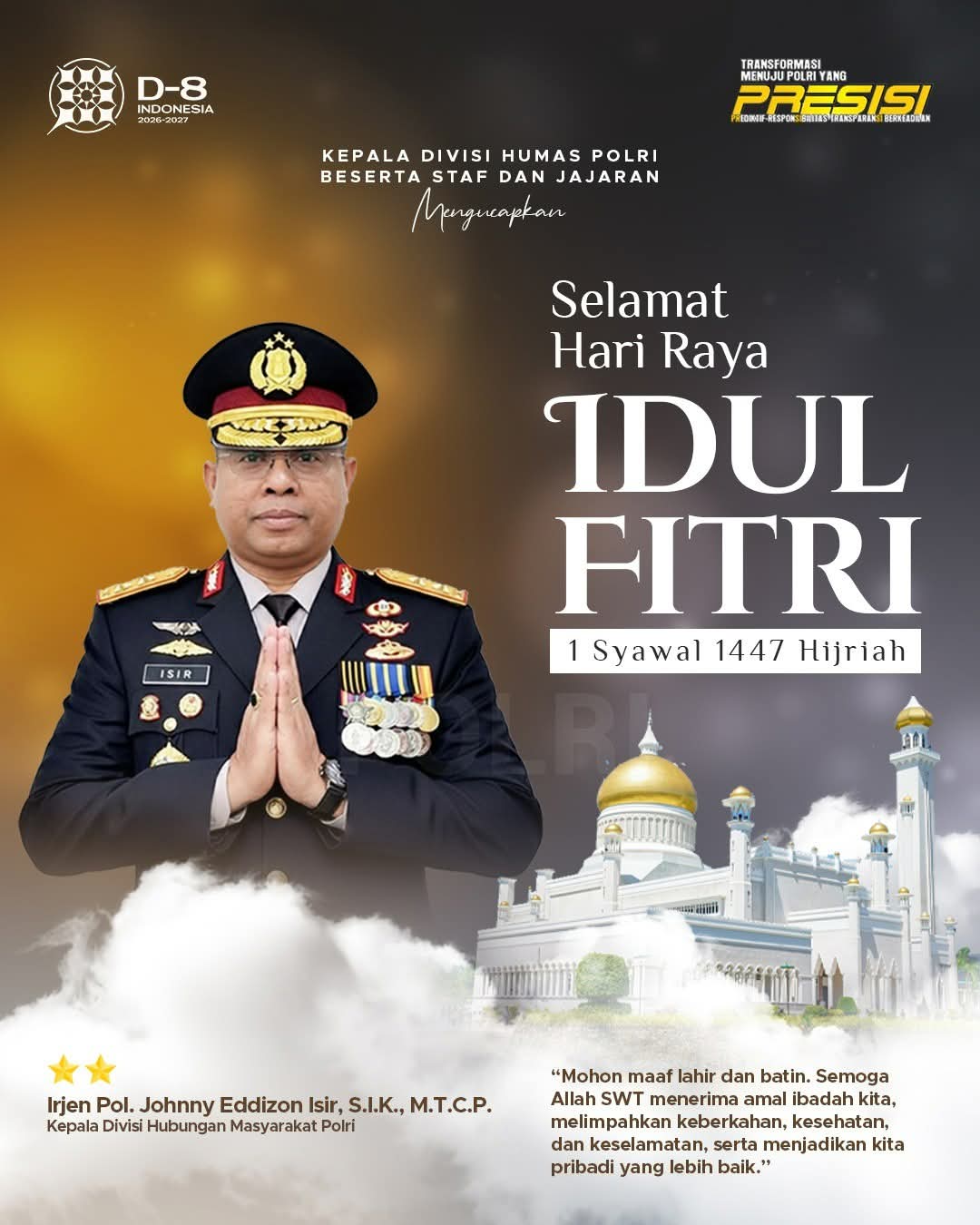 “Semoga Allah SWT menerima amal ibadah kita, melimpahkan keberkahan, kesehatan, dan keselamatan, serta menjadikan kita pribadi yang lebih baik,” ujar Irjen Pol. Johnny Eddizon Isir.