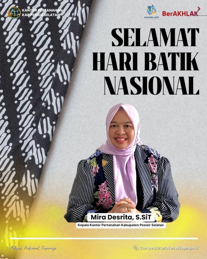 Kepala Kantor Pertanahan Kabupaten Pesisir Selatan, Mira Desrita, S.SiT, memimpin perayaan Hari Batik Nasional 2025 dengan mengucapkan selamat kepada seluruh masyarakat Indonesia. Ia menekankan pentingnya melestarikan dan mengembangkan batik sebagai bagian dari warisan budaya Indonesia.