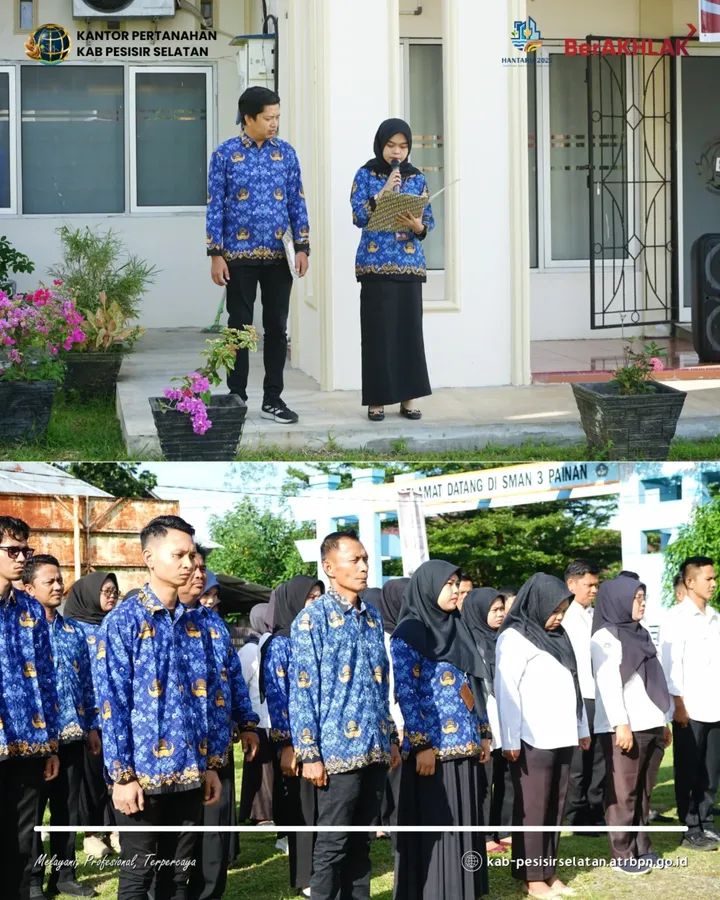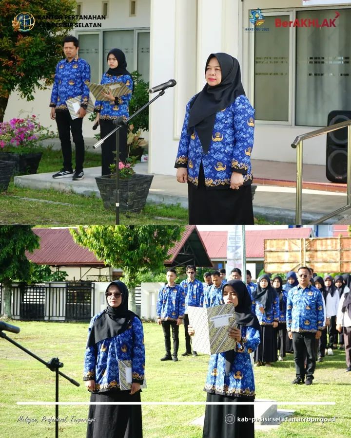 Kepala Kantor Pertanahan Kabupaten Pesisir Selatan, Mira Desrita, S.SiT., bertindak sebagai Inspektur Upacara. Beliau menekankan pentingnya nilai-nilai Pancasila dalam kehidupan berbangsa dan bernegara.