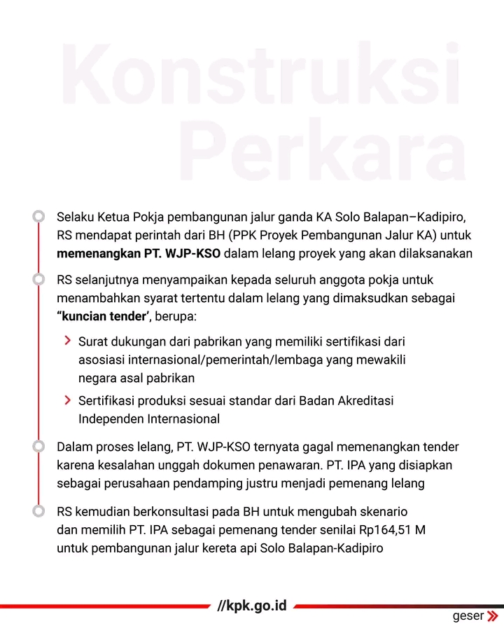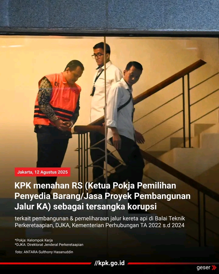 KPK menahan RS selaku Ketua Pokja Pemilihan Penyedia Barang/Jasa Proyek Pembangunan Jalur KA sebagai tersangka korupsi terkait pembangunan & pemeliharaan jalur kereta api di Balai Teknik Perkeretaapian, DJKA, Kementerian Perhubungan TA 2022 s.d 2024