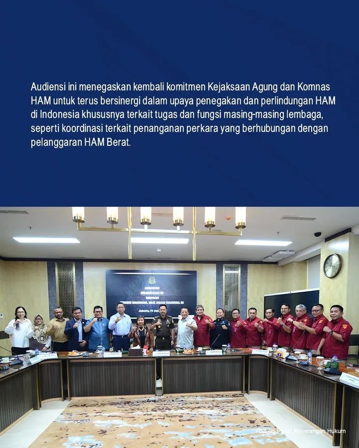 Kejaksaan Agung dan Komisi Nasional Hak Asasi Manusia (Komnas HAM) kembali melakukan audiensi pada Rabu 11 Juni 2025 di Gedung Utama Kejaksaan Agung, guna mempererat kerja sama terkait penegakan hak asasi manusia di Indonesia.