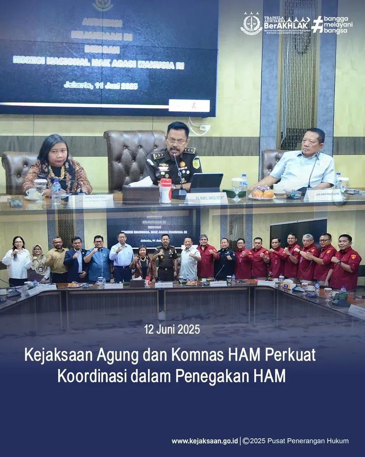 Kejaksaan Agung dan Komisi Nasional Hak Asasi Manusia (Komnas HAM) kembali melakukan audiensi pada Rabu 11 Juni 2025 di Gedung Utama Kejaksaan Agung, guna mempererat kerja sama terkait penegakan hak asasi manusia di Indonesia.