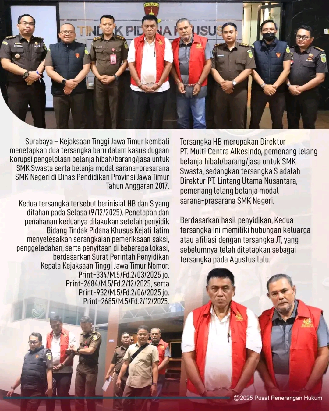 Tersangka HB merupakan Direktur PT. Multi Centra Alkesindo, pemenang lelang belanja hibah/barang/jasa untuk SMK Swasta, sedangkan tersangka S adalah Direktur PT. Lintang Utama Nusantara, pemenang lelang belanja modal sarana-prasarana SMK Negeri. Berdasarkan hasil penyidikan, Kedua tersangka ini memiliki hubungan keluarga atau afiliasi dengan tersangka JT, yang sebelumnya telah ditetapkan sebagai tersangka pada Agustus lalu.