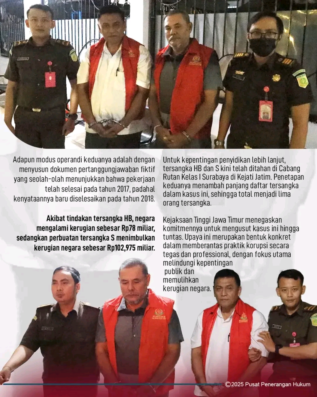 Untuk kepentingan penyidikan lebih lanjut, tersangka HB dan S kini telah ditahan di Cabang Rutan Kelas I Surabaya di Kejati Jatim. Penetapan keduanya menambah panjang daftar tersangka dalam kasus ini, sehingga total menjadi lima orang tersangka.