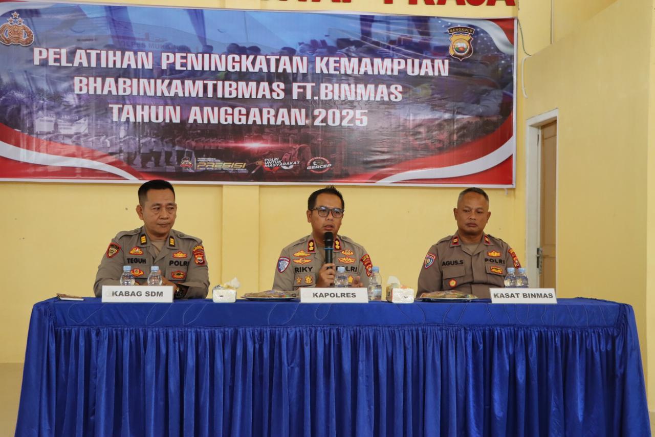 Pelatihan ini dipimpin langsung oleh Kapolres Mukomuko AKBP Riky Crisma Wardana, S.I.K, dan diikuti oleh Kabag SDM Polres Mukomuko AKP Teguh Budiyanto, S.E, Kasat Binmas IPTU Agus Sulaiman, personel Bag SDM, personel Sat Binmas, serta Bhabinkamtibmas dari seluruh Polsek jajaran.