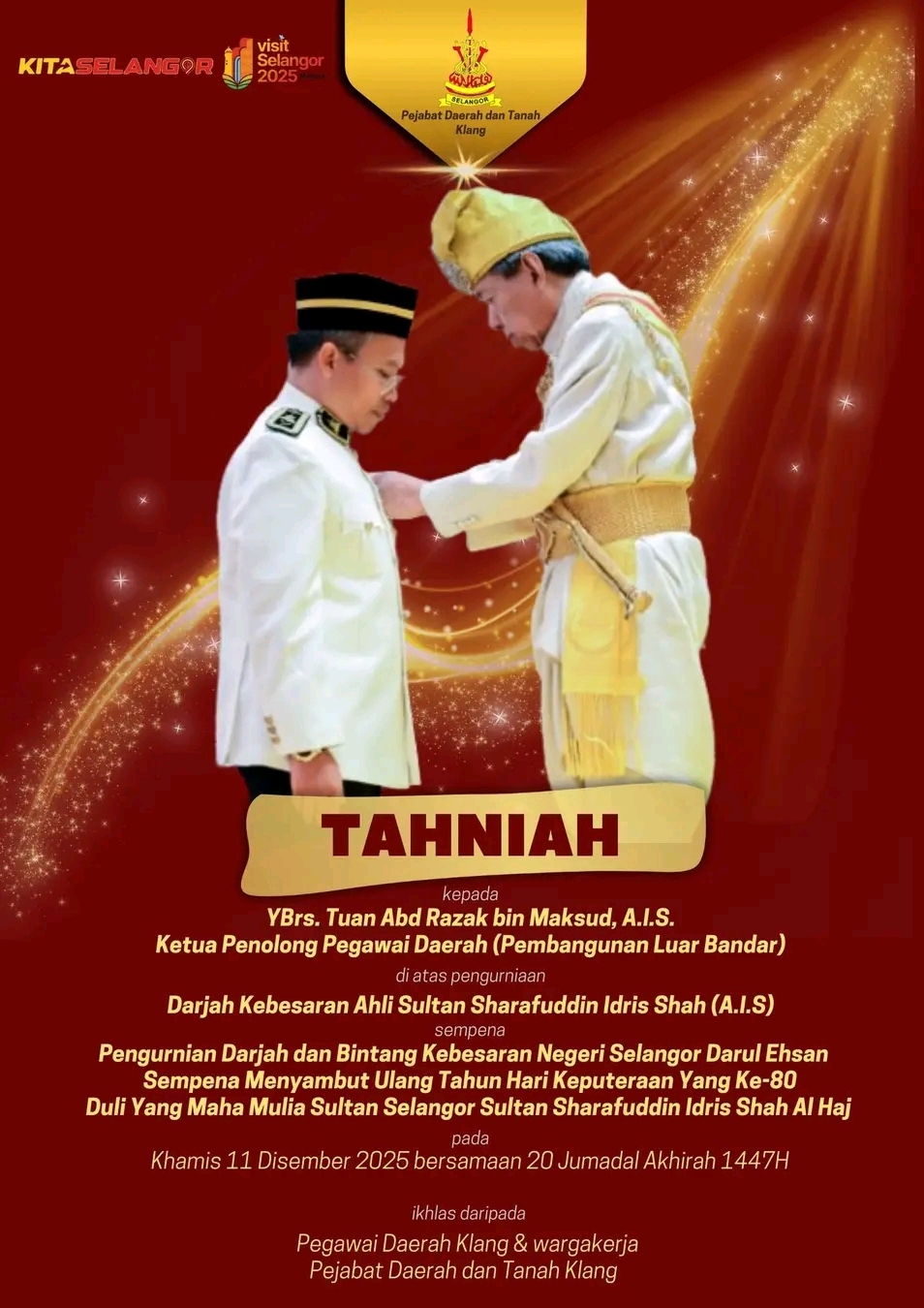 Selangor_Kami mengucapkan setinggi-tinggi tahniah kepada Yang Berbahagia Tuan Abd Razak bin Maksud, Ketua Penolong Pegawai Daerah (Pembangunan Luar Bandar) atas pengurniaan Darjah Kebesaran Ahli Sultan Sharafuddin Idris Shah (A.I.S.) sempena Hari Ulang Tahun Keputeraan Yang Ke-80 Duli Yang Maha Mulia Sultan Selangor Sultan Sharafuddin Idris Shah Al Haj pada Kamis, 11 Desember 2025, bertepatan dengan 20 Jumadal Akhirah 1447 H di Balairong Seri, Istana Alam Shah, Klang.